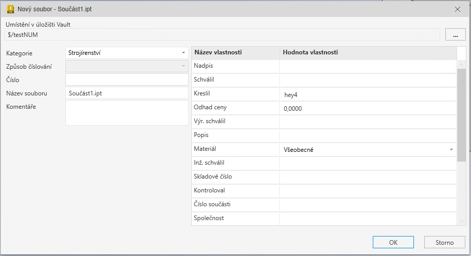 Dialog Data Standard aplikace Vault je dostupný v aplikaci Inventor a AutoCAD. Dialog Data Standard se zobrazí při prvním uložení souboru. Vyplňte požadovaná pole a všechna další pole nastavená správcem a kliknutím na tlačítko OK uložte data. Data jsou uložena jako datový list, který lze v budoucnu upravit.