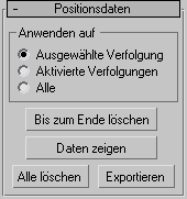 - Löscht alle Positionsdaten der unter "Anwenden auf" angegebenen Verfolger ab dem im Rollout "Filmsteuerung" momentan angegebenen Frame. Mit dieser Funktion können Sie einen Teil der Verfolgung löschen und vollständig neu erstellen.