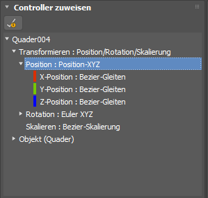 Durch den Position-XYZ-Controller werden die X-, Y- und Z-Komponenten in drei getrennte Spuren aufgeteilt, ähnlich wie beim Euler-XYZ-Rotations-Controller. Sie erhalten dadurch unabhängige Steuermöglichkeiten für die drei Spuren, wenn diese von Ausdruck-Controllern verwendet werden.