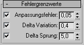 Das Rollout "Fehlergrenzwerte" des Dienstprogramms "Kameraverfolgung" versucht, Fehler beim Verfolgen von Merkmalen zu identifizieren, indem es Werte misst und sie mit den Grenzwerten vergleicht, die Sie in diesem Rollout eingestellt haben. Diese Fehlersuche kann sowohl während der manuellen Überarbeitung einer Verfolgung (siehe Rollout "Stapelverfolgung") als auch während der eigentlichen Verfolgung aktiviert werden, um Fehler mit dem Kontrollkästchen "Neues Sample bei Fehler" im Bereich "Verfolger einrichten" des Rollouts Bewegungsverfolgung zu korrigieren.