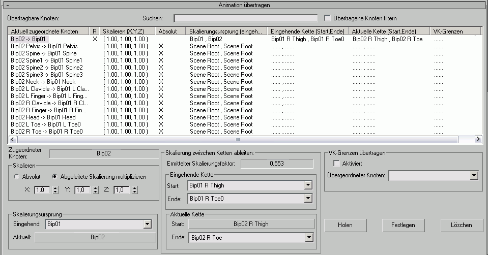 Beispiel: Wenn Sie eine Biped-Animation auf ein anderes Biped übertragen möchten, ordnen Sie die Position des eingehenden Biped-Objekts dem aktuellen Biped zu.