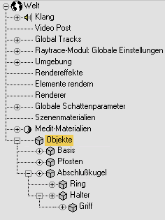 In der Abbildung wird zum Befestigen des Knaufs am Ring ein Pfad-Controller verwendet. Die IK-Kette vom übergeordneten zum untergeordneten Objekt lautet: Pfosten->Abschlusskugel->Knauf->Griff. Der Ring ist das untergeordnete Objekt der Abschlusskugel, aber nicht Teil der IK-Kette.