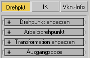 Anmerkung: Die Funktionen im Rollout "Drehpunkt anpassen" können nicht animiert werden. Wenn Sie den Drehpunkt des Objekts in einem Frame ändern, wird diese Änderung für die gesamte Animation übernommen. Seien Sie deshalb beim Ändern des Drehpunkts eines animierten Objekts vorsichtig. Das Ändern des Drehpunkts in einem Frame kann zu unerwarteten Auswirkungen in anderen Teilen der Animation führen. Nach Möglichkeit sollten Sie den Drehpunkt an der gewünschten Position platzieren, bevor Sie mit dem Animieren beginnen.