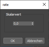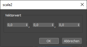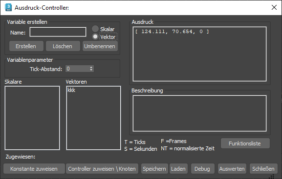 - Geben Sie den auszuwertenden Ausdruck ein. Die Eingabe muss ein gültiger mathematischer Ausdruck sein. Als Ergebnis wird entweder ein 3-Werte-Vektor bei Vektorausdrücken (Position, Skalierung oder Point3) oder ein Skalarwert bei Gleitkommawert-Ausdrücken ausgegeben.