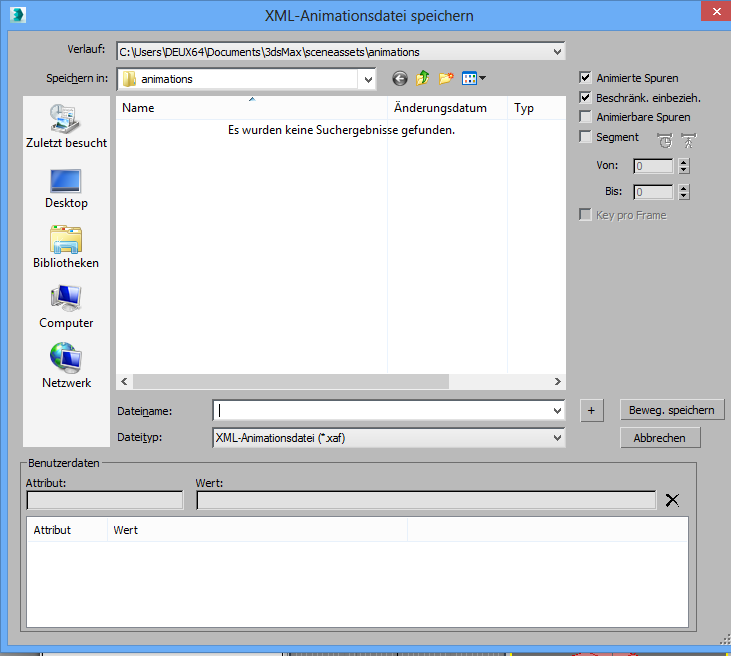 Mit dem Befehl "Animation speichern" können Sie Animationen aus der Szene im Format "XML Animation File" (XAF) auf der Festplatte speichern. Mit dem Dateiformat "XAF" können Sie Animationen für eine beliebige Anzahl von Objekten getrennt von der eigentlichen Szene speichern und laden.