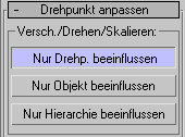 - Diese Schaltfläche setzt den Drehpunkt auf die Position und Ausrichtung zum Zeitpunkt der Objekterstellung zurück. Der Status der Schaltflächen "Nur Drehpunkt beeinflussen" und "Nur Objekt beeinflussen" hat hierauf keinen Einfluss.
