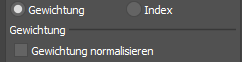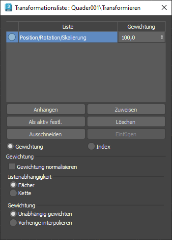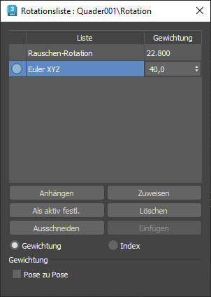 Unabhängig gewichten | Die Gewichtungslisteneinträge werden dann unabhängig voneinander kombiniert. Gewichtung der Rotationskomponente geklammert zwischen [-100 %,100 %].