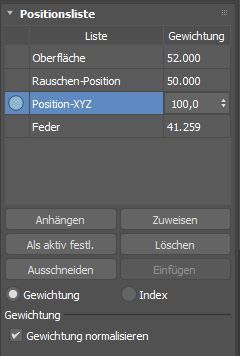 Standardmäßig ist die Gewichtungseinstellung jedes aufgeführten Controllers auf 100,0 eingestellt. Diese Einstellung kann geändert werden, um den Effekt des Controllers auf ein Objekt zu verstärken oder zu verringern.