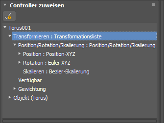 Wenn Sie einen Controller über das Menü "Animation" zuweisen, wird automatisch ein Listen-Controller als Vorgabe zugewiesen, und der ausgewählte Controller erscheint in der Liste an erster Stelle. Dieses Verhalten unterscheidet sich von dem, das beim Zuweisen eines Controllers in der Bewegungsgruppe oder in der Spuransicht zu beobachten ist, wenn nur der angegebene Controller zugewiesen wird.