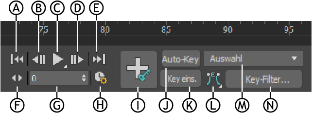 Animation und Zeitsteuerelemente: A. Gehe zum Anfang,B. Vorheriges/r Frame/Key, C Wiedergabe/Stopp, D. Nächstes/r Frame/Key, E. Gehe zum Ende, F. Key-Modus ein/aus, G. Aktuelles Frame (Gehe zu Frame), H. Zeitkonfiguration, I. Animationsmodus Key einstellen, J. Automatischer Key-Modus ein/aus, K. Modus Key einstellen ein/aus, L. Standard-Hinein/Heraus-Tangenten für neue Keys, M. Auswahlliste, N. Keyfilter