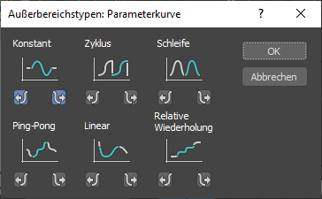 Über das Dialogfeld Außerbereichstypen für Parameterkurve stehen Ihnen vier Möglichkeiten zum Wiederholen einer Animation und zwei Möglichkeiten zum Anwenden linearer Werte zur Verfügung.