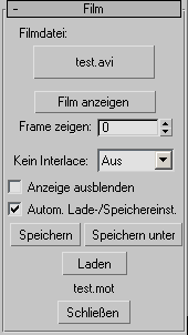 Wenn die Option "Einstellungen automatisch laden/speichern" deaktiviert ist, können Sie für eine neue Filmdatei entweder ganz neue Einstellungen vornehmen, die Datei mit den bestehenden Einstellungen laden oder die aktuellen Einstellungen in einer neuen Datei speichern. Der Name der aktuellen Verfolgungsdatei wird unten im Rollout "Film" angezeigt.