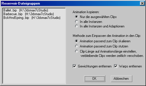 Animation passend zum Clip skalieren Skaliert die Länge des geladenen Clips, sodass er die gleiche Länge wie der zu ersetzende Clip in der Spur hat.