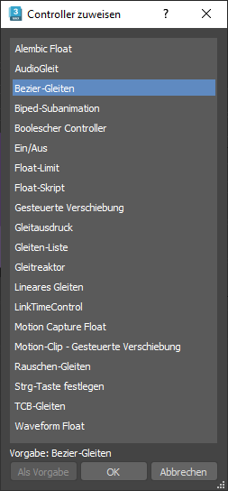 Rollout „Controller zuweisen“. Das Rollout „Controller zuweisen“ befindet sich in der Bewegungsgruppe und dient der Verwaltung von Transformations-Controllern. Im Dialog „Controller zuweisen“ können Sie Animations-Controller auswählen und zuweisen.