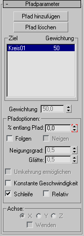 Nachdem Sie eine Pfadbeschränkung zugewiesen haben, können Sie auf ihre Eigenschaften in der Gruppe "Bewegung" Rollout "Pfadparameter" zugreifen. In diesem Rollout können Sie Ziele hinzufügen oder löschen, Gewichtungen zuweisen und Gewichtungswerte für jedes Ziel animieren.