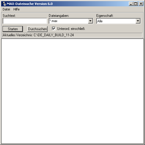 Hier wird angegeben, welcher Dateityp durchsucht werden soll. Vorgegeben ist der Dateityp *.max. Hier kann ein anderer Dateityp eingegeben werden, z. B. *.dwg. Wenn Sie hier *.* eingeben, werden alle Dateien durchsucht.
