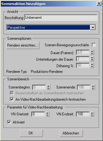 Die Schaltfläche "Szenenaktion hinzufügen" fügt der Warteschlange die Szene in der ausgewählten Kamera-Ansicht hinzu. Eine Szenenaktion ist eine Ansicht der aktuellen 3ds Max-Szene. Sie können wählen, welche Ansicht angezeigt wird und wie Sie die Szene mit dem endgültigen Video synchronisieren möchten. Wie Bildeingabeaktionen setzen Szenenaktionen ein Bild in die Warteschlange. Allerdings ist eine Szenenaktion stets die aktuelle 3ds Max-Szene und muss gerendert werden, wenn Sie die Warteschlange für die Video-Nachbearbeitung ausführen. Die Szene wird genau so wie vom Scanline-Renderer gerendert, wobei zusätzlich die unten aufgelisteten Optionen verwendet werden. Das daraus resultierende Szenenbild hat einen Alpha-Kanal.
