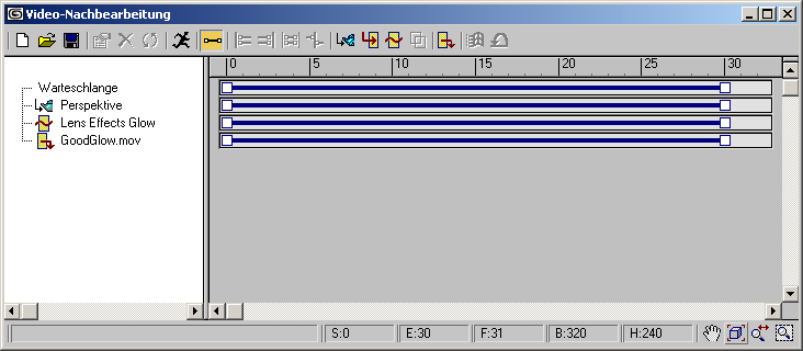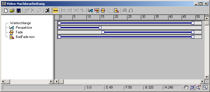 In dieser Warteschlange sind alle richtigen Aktionen in der richtigen Reihenfolge zu sehen. Das Problem liegt im Zeitablauf und in der Positionierung der Bereichsleisten. Die wahrscheinlichste Ursache des Problems ist die unnötige Aktivierung der Option "Auswahl aufeinander folgend". Damit die Aktion "Ausblenden" richtig funktioniert, muss sie mit der Animation so lange überlappen, wie das Ausblenden dauern soll. Sie müssen dabei die Anzahl der Frames in Betracht ziehen, bei denen die Szene ausgeblendet werden soll.