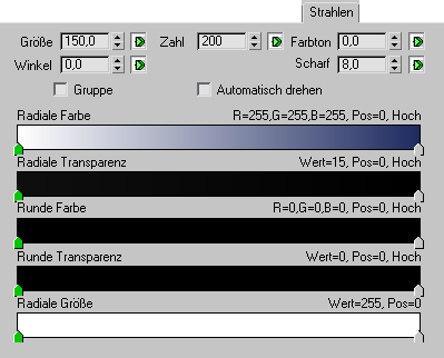 Gibt den Winkel für die Strahlen an. Sie können sowohl positive als auch negative Werte eingeben, mit denen sich die Strahlen bei der Animation im bzw. gegen den Uhrzeigersinn drehen. Dieser Parameter kann animiert werden.