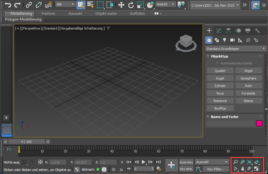 Die Steuerelemente zur Navigation sind davon abhängig, welches Ansichtsfenster gerade aktiv ist. Perspektiv-Ansichtsfenster, orthogonale Ansichtsfenster, Kamera-Ansichtsfenster und Lichtquellen-Ansichtsfenster besitzen jeweils spezielle Steuerelemente. Die Bezeichnung "orthogonal" verweist auf Benutzeransichten sowie das Ansichtsfenster von oben, das Ansichtsfenster von vorn usw. Das Flyout "Zoom Grenzen: Alle" und die Option "Ansichtsfenster maximieren ein/aus", verfügbar in allen Ansichtsfenstern, sind in den Steuerelementen von Perspektiv-Ansichtsfenstern und orthogonalen Ansichtsfenstern enthalten.