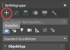 In der Erstellungsgruppe sind die Arten von Objekten, die Sie erstellen können, in sieben Kategorien unterteilt. Jede Kategorie verfügt über eine eigene Schaltfläche. Innerhalb jeder Kategorie können verschiedene Objekt-Unterkategorien verfügbar sein. In einer Dropdown-Liste können Sie eine Objekt-Unterkategorie wählen. Jeder Objekttyp verfügt über eine eigene Schaltfläche, auf die Sie klicken können, um mit der Erstellung zu beginnen.