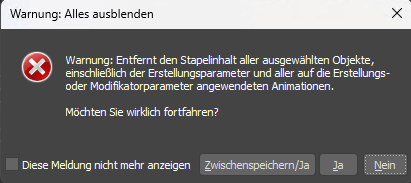 Sie werden in einem Warndialogfeld daran erinnert, dass der Ausblendevorgang nicht rückgängig gemacht werden kann, und Sie erhalten die Möglichkeit, den Vorgang anzuhalten, bevor das Objekt umgewandelt wird.