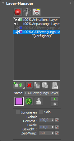Das Layersystem in CAT ist einfach ein Mechanismus für die Zuordnung und Verwaltung von Animations-Controllern. Es unterstützt alle 3ds Max-Animations-Controller, darunter die verschiedenen Keyframe-Controller wie Bezier, TCB, Linear, Quaternion und Euler sowie Prozedur-Controller wie Skript- und Ausdruck-Controller und Beschränkungen.
