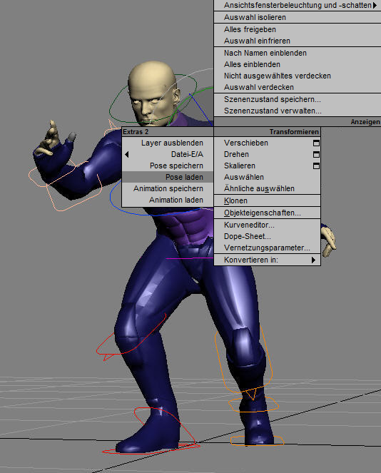"Pose laden" ist wie alle Dialogfelder dieser Funktion modusunabhängig. Während Sie die Parameter der geladenen Stellung bearbeiten, können Sie also das Ansichtsfenster drehen, den Zeitschieber ziehen und das Ergebnis überprüfen. Als einzige Ausnahme führt die Aufhebung der Auswahl eines Bones zum Abbruch des Ladevorgangs.