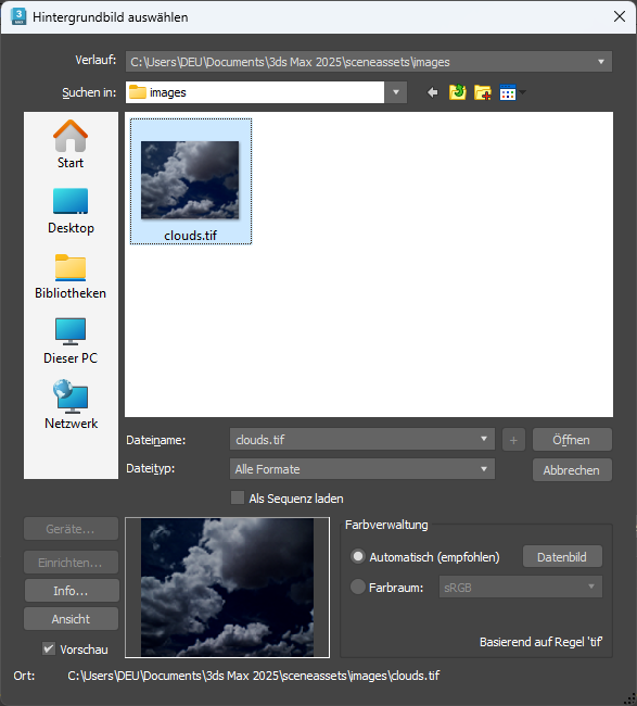 Mit dem Dialogfeld "Hintergrundbild auswählen" können Sie eine Datei oder eine Sequenz von Dateien als Ansichtsfensterbild auswählen.