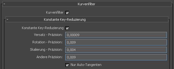 | Nur Auto-Tangenten | Diese Option stellt sicher, dass nur Keys vom Typ "auto" (Automatisch) gefiltert werden. Anderenfalls ist es möglich, dass Keys mit Interpolationswerten, die über einem bestimmten Grenzwert liegen, gelöscht werden. |
