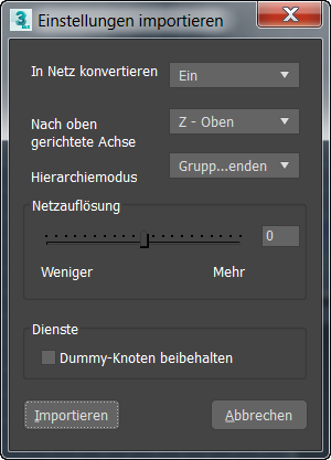 - Legt die Auflösung von Objekten fest, wenn Sie diese als bearbeitbare Netz-Objekte importieren. Höhere Werte führen zu detaillierteren Objekten, die kostspieliger hinsichtlich Zeit und Speicherplatz sein können. Niedrigere Werte führen zu weniger detaillierten Objekten. Bereich = –10 bis 10. Vorgabe = 0.