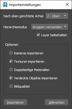 - Abgeflacht: Objekte werden nicht gruppiert und als unabhängige 3ds Max-Objekte importiert.