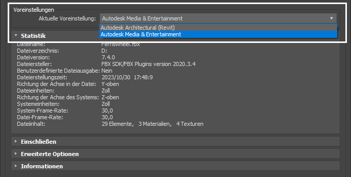 Das 3ds Max FBX plug-in enthält zwei Voreinstellungen für den Import-Arbeitsablauf: