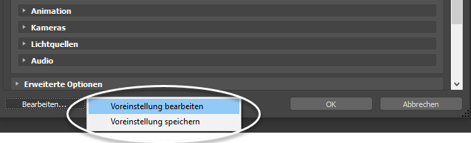 Mithilfe der Schaltfläche "Voreinstellung bearbeiten" können Sie benutzerdefinierte Voreinstellungen mit eigenen definierten Einstellungen erstellen und speichern.