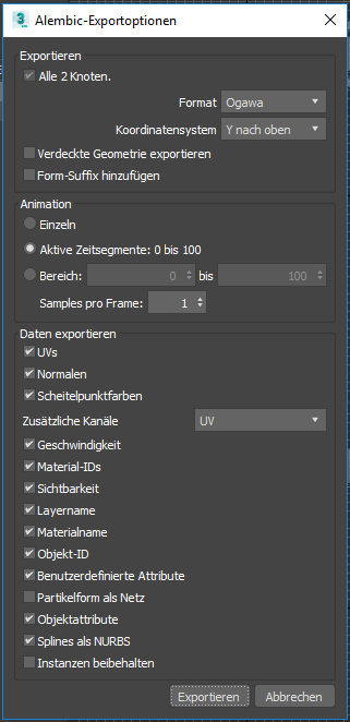 Beim Exportieren einer Alembic-Datei werden automatisch Daten exportiert für: