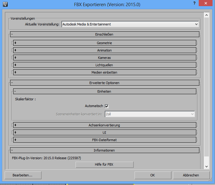 Aktivieren Sie die Option Automatisch, wenn das 3ds Max FBX plug-in die Einheiten der eingehenden Datei automatisch erkennen und entsprechend den Einheiten der Host-Anwendung einstellen und konvertieren soll.
