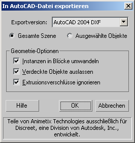 Anmerkung: Der DXF-Export kann nur Netzdaten exportieren. Alle Konturobjekte und Splines werden somit als Netzobjekte exportiert. Deshalb werden offene Splines (die nicht in Netzobjekte konvertiert werden können) in Ihrer Szene nicht exportiert.