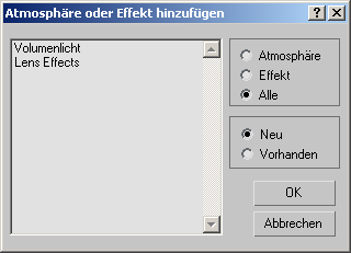 Mit dem Dialogfeld "Atmosphäre hinzufügen" oder "Effekt hinzufügen" können Sie eine Atmosphäre oder einen Rendereffekt mit dem Licht verknüpfen. In der Liste werden Atmosphären, Rendereffekte oder beides angezeigt. In dieser Liste sind nur Atmosphären und Effekte enthalten, die mit Lichtobjekten verknüpft werden können oder Lichtobjekte als Apparat verwenden.