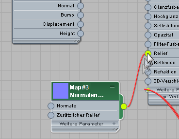 Da das Substance-Map verschiedene Ausgabetypen liefert, können Sie ein Map mehreren Materialeingängen zuordnen, wie das folgende Beispiel zeigt, in dem die Normalen-Ausgabe der Substance als Relief-Map verwendet wird.