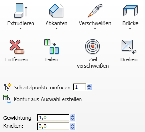 Wählen Sie die Kanten, legen Sie fest, wie viele Scheitelpunkte auf jeder Kante eingefügt werden sollen, und klicken Sie auf "Scheitelpunkte einfügen". Die Scheitelpunkte werden in gleichmäßigem Abstand entlang der ausgewählten Kante eingefügt. Außerdem wird die Unterobjektebene "Scheitelpunkt" aktiviert, und die neuen Scheitelpunkte werden ausgewählt.