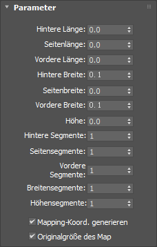Anmerkung: Die Objektmaße (Rückseite, Seite, Vorderseite) sind so beschriftet, als seien sie im Ansichtsfenster von oben oder im Perspektivansichtsfenster erstellt worden und würden von der Vorderseite des Weltbereichs betrachtet.