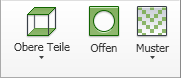 Die Gruppe "Auswählen" enthält die Hilfsmittel "Spitzen", "Offen" und "Muster" für Unterobjektauswahlen auf allen Ebenen, zusätzlich das Hilfsmittel "Hart" für das Auswählen von Kanten an den Rändern von Glättungsgruppen sowie weitere Auswahlhilfsmittel für Polygone.