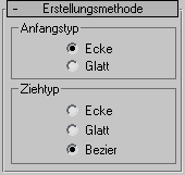 Die Optionen für Erstellungsmethoden bei Linien unterscheiden sich von anderen Spline-Hilfsmitteln. Durch die Auswahl dieser Optionen steuern Sie den Scheitelpunkttyp, den Sie durch Klicken oder Ziehen erstellen.