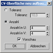 - Toleranz Baut die Oberfläche nach einem Genauigkeitswert neu auf. Je geringer der Toleranzwert, desto genauer der Neuaufbau. Durch Erhöhen des Toleranzwerts kann die Oberfläche mit weniger KS neu aufgebaut werden.