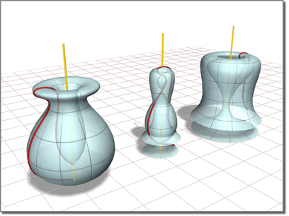 Die gedrehte Oberfläche dreht sich um die lokale Y-Achse des NURBS-Modells. Der ursprüngliche Drehbetrag ist 360 Grad. Ein Gizmo (Vorgabefarbe Gelb) gibt die Achse der Drehung an. Durch Transformieren des Gizmos der gedrehten Oberfläche wird die Form der Drehung geändert. Sie können die Drehung entlang einer Achse durchführen, die nicht an einer lokalen Koordinatenachse ausgerichtet ist.