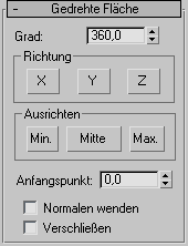 Wenn Sie die Normale eines Drehungsverschlusses umkehren möchten, markieren Sie sie als Oberflächen-Unterobjekt, und wählen Sie im Rollout "Fläche allgemein" die Option "Normalen umkehren".