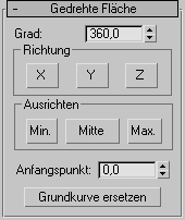 Wenn ein Drehverfahren-Unterobjekt ausgewählt ist, wird unten in der Modifikatorgruppe ein Rollout mit den Drehverfahren-Parametern angezeigt.