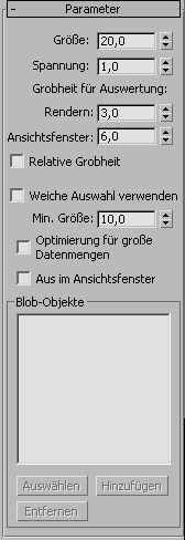 Anmerkung: Die sichtbare Größe der Metabälle wird durch den Wert "Spannung" beeinflusst. Wenn "Spannung" auf den kleinstmöglichen Wert gesetzt wird, gibt der Radius der einzelnen Metabälle die Einstellung unter "Größe" exakt wieder. Durch höhere Spannungswerte wird die Oberfläche gestrafft, wodurch die Metabälle kleiner ausfallen.
