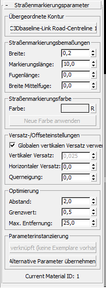 Wenn eine Straßenmarkierung über eine Bodenoberfläche drapiert wird, muss sie, um sichtbar zu sein, leicht über die zugrunde liegende Oberfläche angehoben werden. Das Rollout Szeneneinstellungen verfügt dafür über eine globale Einstellung. Es kann vorkommen, dass einzelne Straßenmarkierungsobjekte etwas weiter angehoben werden müssen, um ungewöhnlichen Konturen in der zugrunde liegenden Oberfläche gerecht zu werden. Deaktivieren Sie in diesem Fall die Option Globalen vertikalen Versatz verwenden und legen Sie einen lokalen Wert fest.