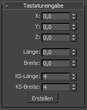 Mit dem Rollout "Tastatureingabe" können Sie eine NURBS-Oberfläche über die Tastatur erstellen. Verwenden Sie die Tabulatortaste, um sich zwischen den Steuerelementen dieses Rollouts zu bewegen. Um die Schaltfläche "Erstellen" über die Tastatur zu betätigen, drücken Sie die Eingabetaste, während die Schaltfläche aktiv ist.